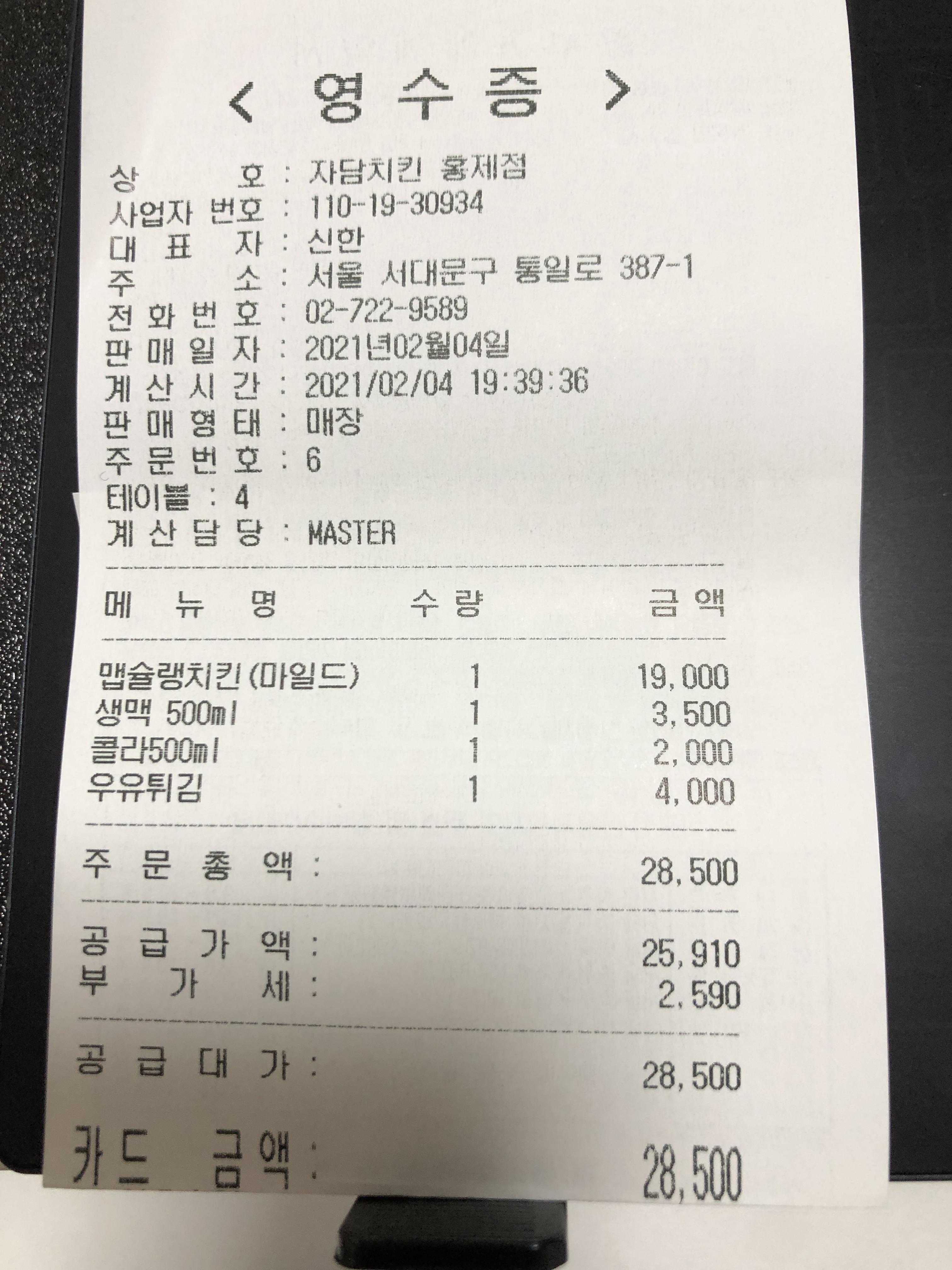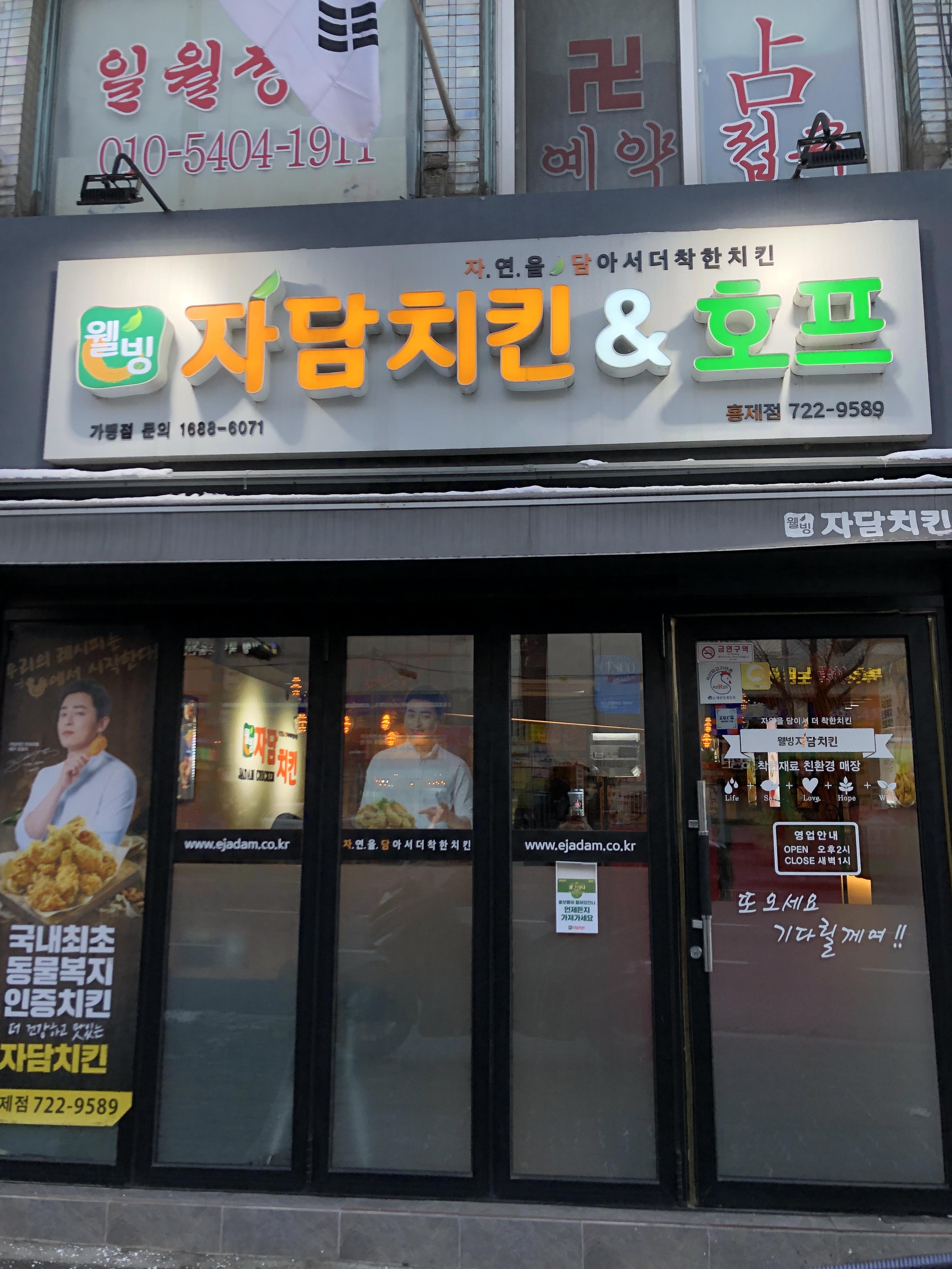 자담치킨 홍제점은 무악재역 4번 출구에서 300m 정도 떨어져 있다. 나는 자담치킨 서울홍제점에 두 번째 방문이었다. 지난번에는 테이크 아웃해서 집에 가서 먹었는데 이번에는 홀에서 먹었다. 현재 서울은 거리두기 2.5단계이지만 밤 9시 이전까지는 매장에서 취식할 수 있도록 조치가 완화되어 오랜만에 외식을 했다.