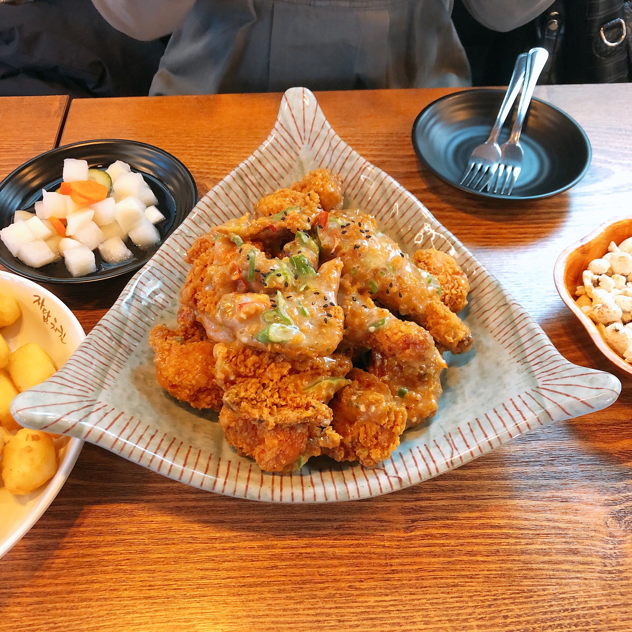 순살보다는 부위를 알 수 있는 뼈 있는 닭을 선호해서 뼈닭으로 시켰다. 그런데 닭다리가 3개였다...!!! 홀 손님 서비스인 것일까? 아니면 닭을 여러 마리 같이 튀겼는데 닭다리 한 개가 우리 접시에 하나 더 들어온 것일까? 어쨌든 그래서 나는 닭다리를 2개나 먹는 호사를 누렸다.