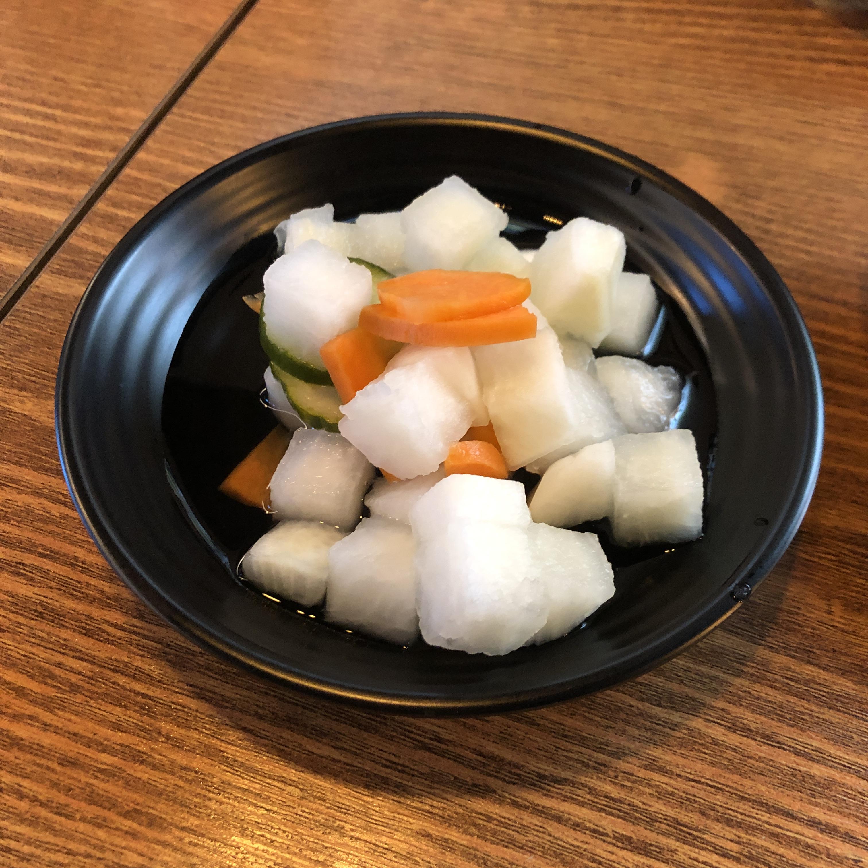 자담치킨의 치킨무는 상당히 건강한 맛이다. 무 말고 오이 피클과 당근이 들어 있는 점도 특색 있다. 색깔 조합도 좋고 맛도 좋다. 자담치킨의 치킨무는 매장에서 직접 만든다고 한다. 빙초산과 사카린, 방부제가 안 들어 간다고 강조하고 있다.