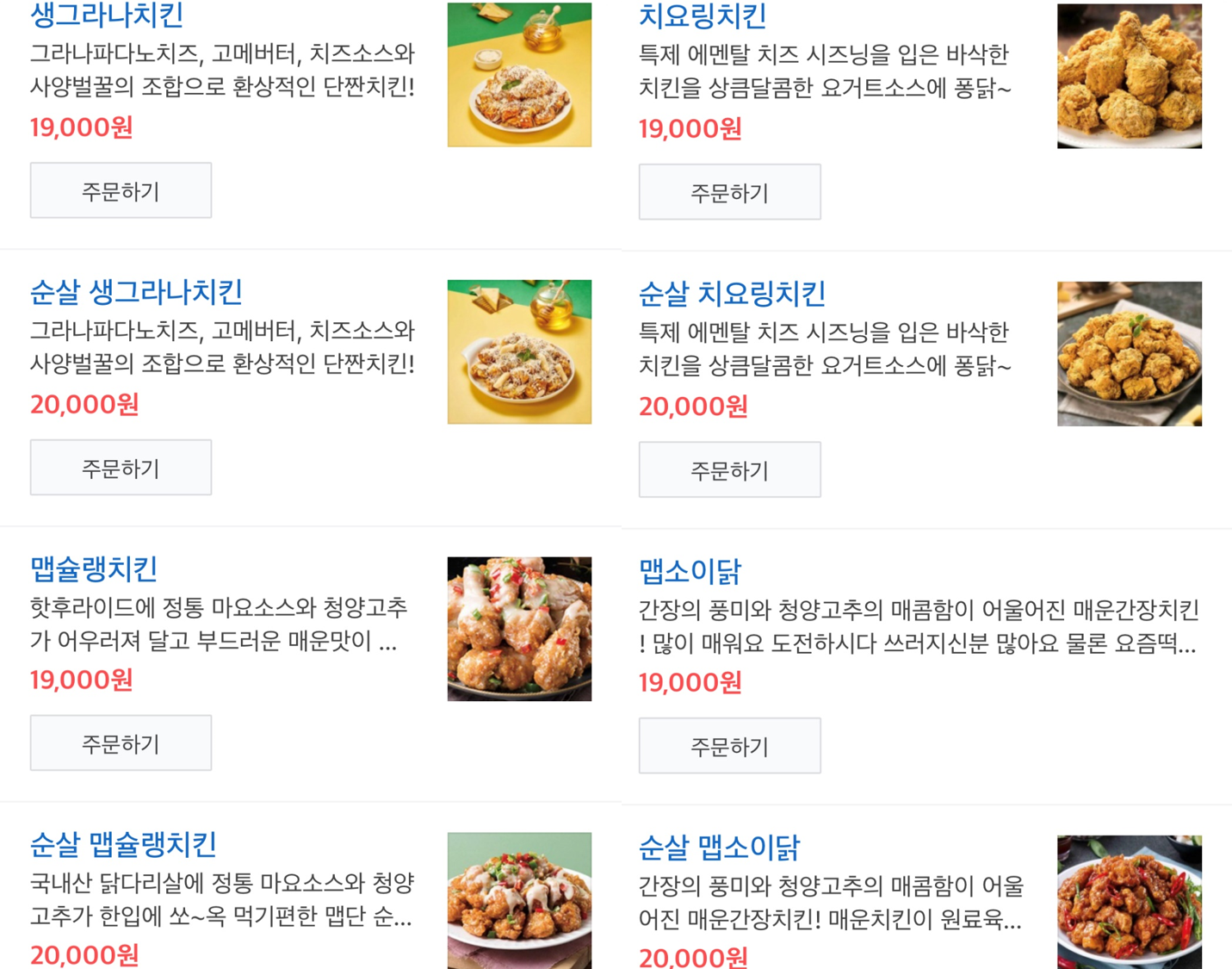 위 메뉴들은 자담치킨의 신메뉴들이다. 생그라나 치킨, 맵슐랭치킨, 맵소이닭, 치요링치킨이다. 맵슐랭치킨은 일반 맛과 덜 매운 마일드 맛이 있다. 간혹 마일드를 팔지 않는 매장들도 있으니 참고하시길 바란다. 서울 홍제점은 마일드 맛도 주문 가능해서 나는 마일드로 시켰다. #자담치킨메뉴추천