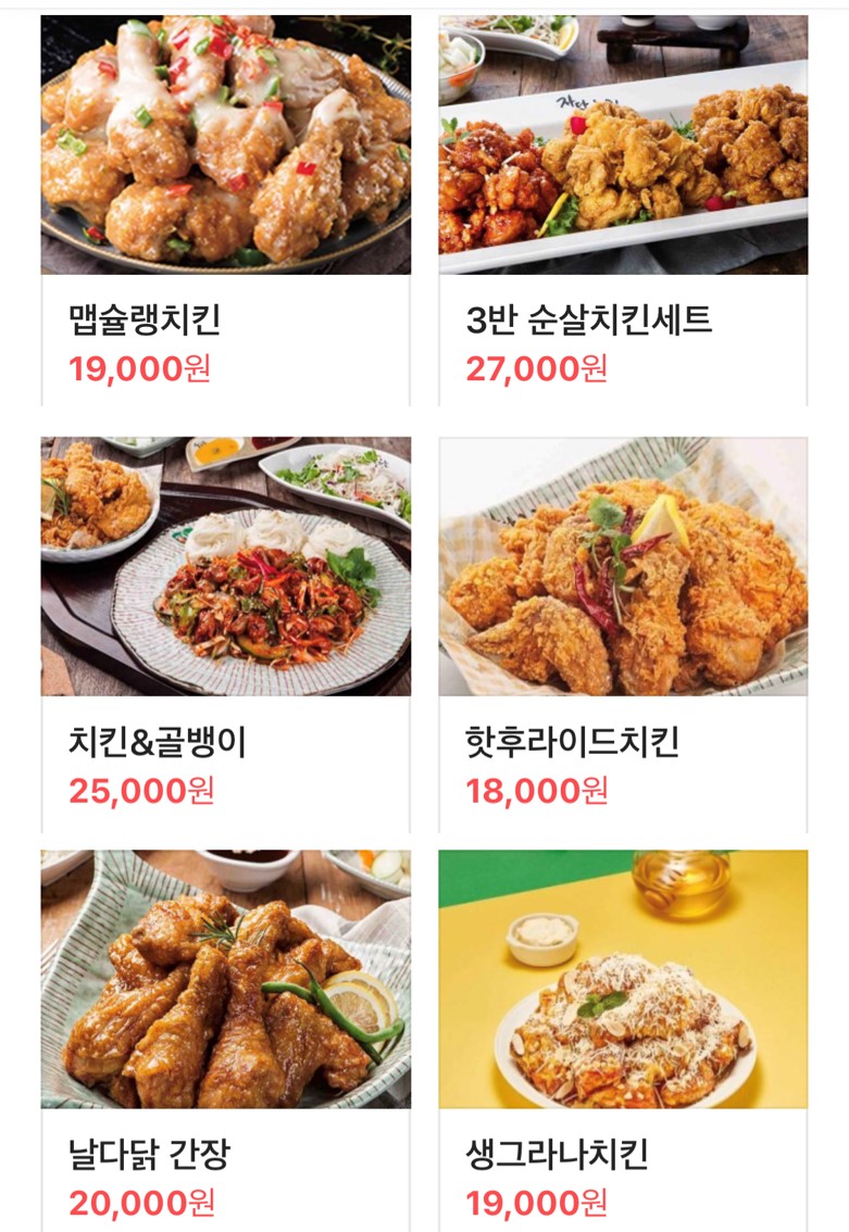 자담치킨 메뉴판을 직접 찍지 못해서 배달의 민족 어플을 참고해서 메뉴를 가져와봤다. 위 사진은 가장 인기 있는 대표 메뉴 6종이다. 맵슐랭 치킨과 3반 순살치킨세트, 치킨&골뱅이, 핫 후라이드 치킨, 날다닭 간장, 생그라나 치킨이다.