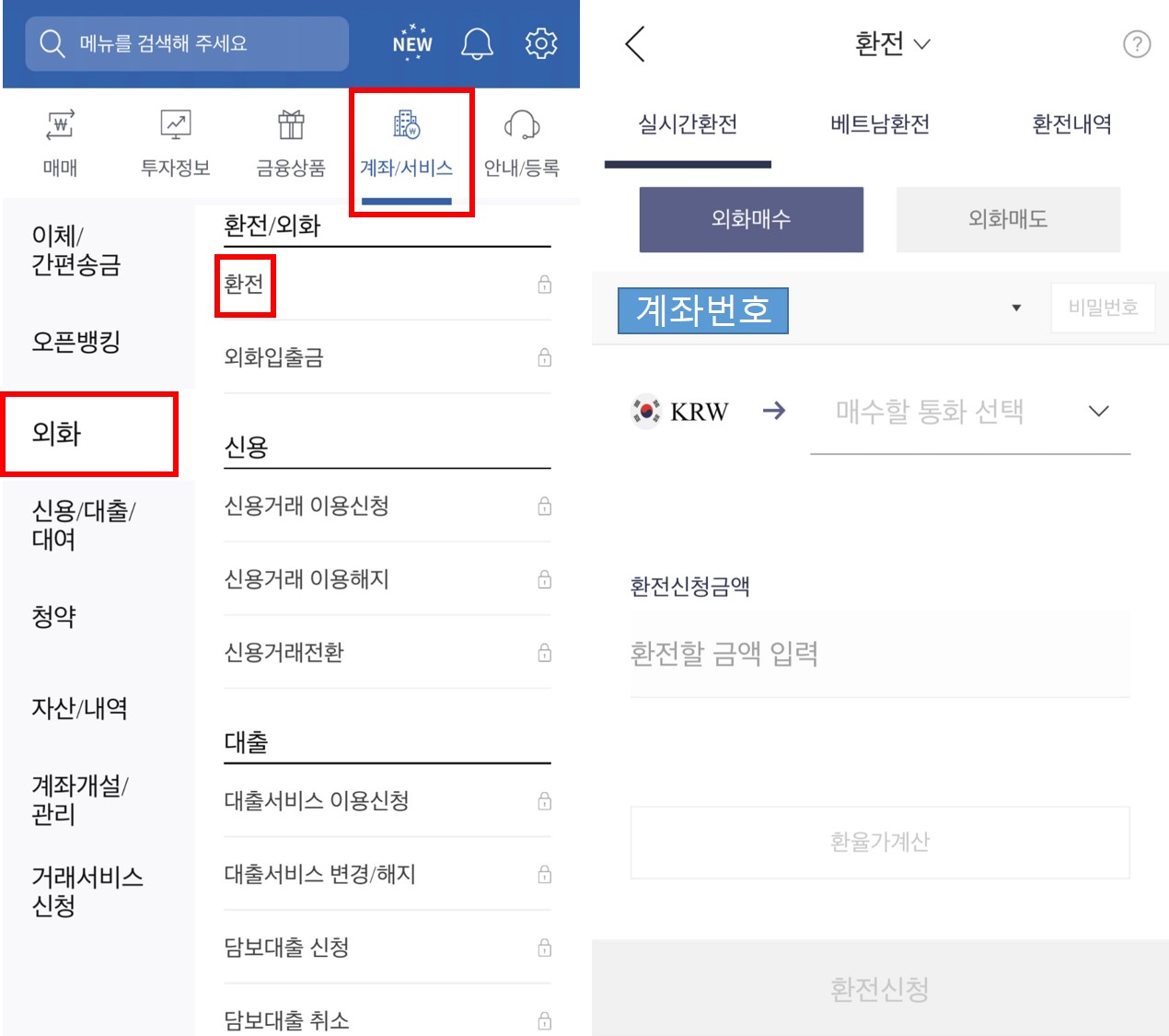 [메뉴] - [계좌/서비스] - [외화] - [환전]을 클릭합니다. [환전] 화면에서 원하는 통화로 선택 후 금액을 입력한 후 [환전 신청]을 하시면 됩니다. 자세한 방법은 아래 포스팅을 확인해 주세요!