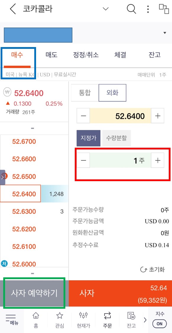 코카콜라 주식을 살 것이기 때문에 [매수]를 그대로 둔 상태에서 사고자 하는 주식 수량을 입력했습니다. 그러면 제가 갖고 있는 돈에 맞춰서 하단에 주문 가능 수량, 주문 가능 금액, 원화 환산 금액, 추정 수수료가 계산됩니다. (저는 이미 주식을 산 후에 포스팅을 위해 다시 화면에 들어갔더니 다 0으로 뜨네요.) 내용을 확인 후 [사자] 버튼을 클릭합니다.