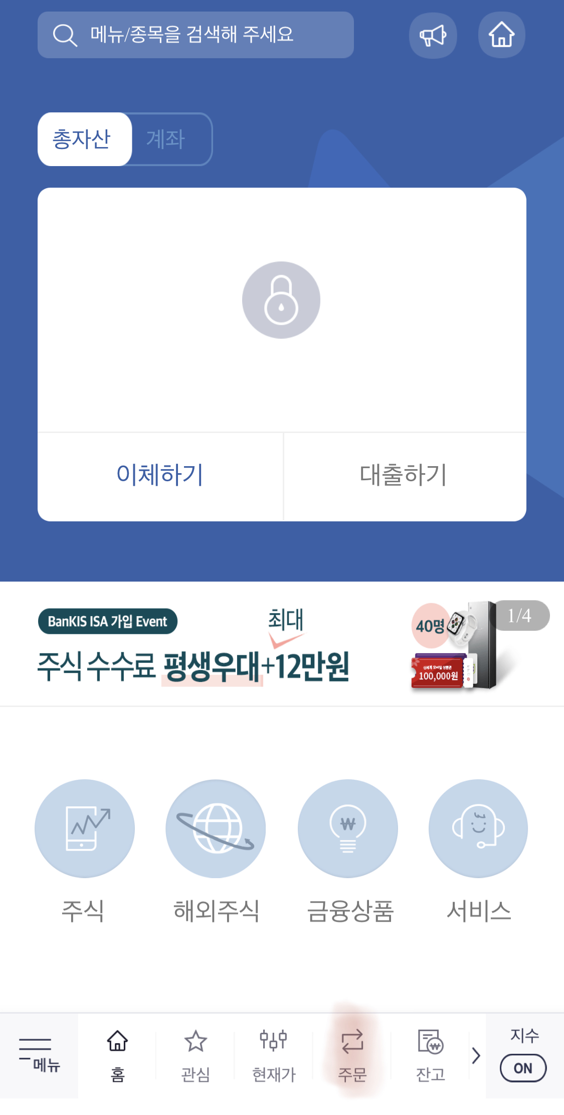 [한국투자증권] 어플 메인 화면 하단에 있는 [주문] 버튼을 클릭합니다.