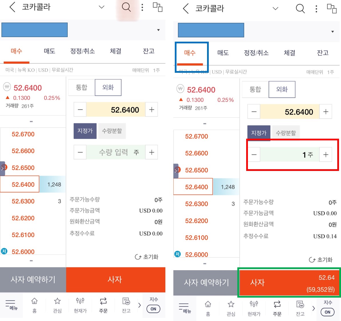 [주문] 화면 상단의 돋보기 모양을 클릭하여 사고자 하는 해외주식을 검색합니다. 저는 코카콜라를 사려고 창에 띄워 놨습니다.