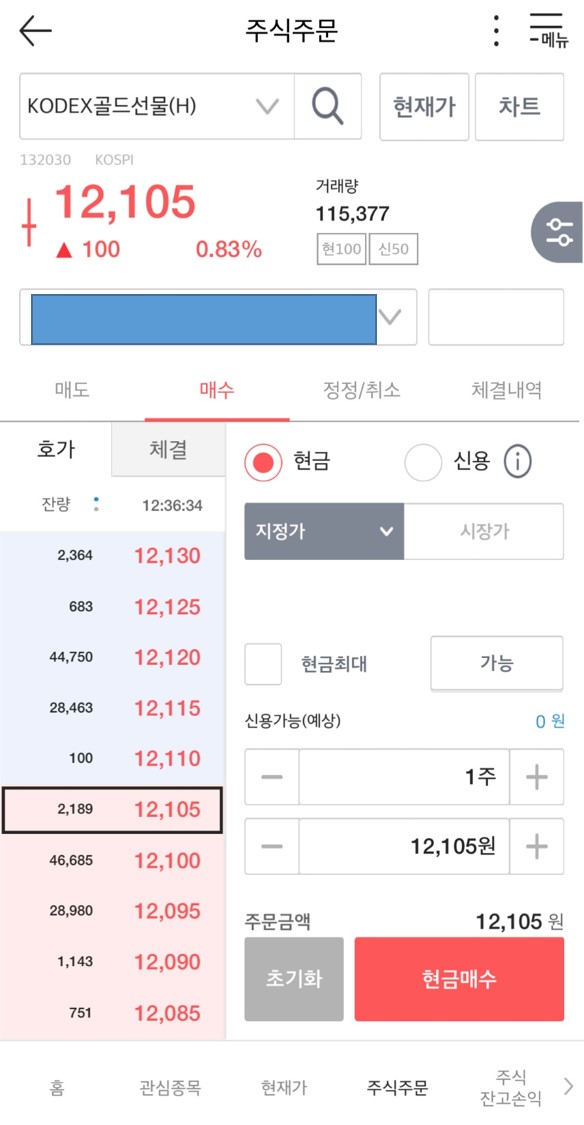 - ETF 주문은 주식 주문 방법과 동일합니다. [메뉴] - [국내주식] - [주식 매매] - [주식주문]으로 들어갑니다. [주식주문] 창에서 [매수]을 클릭 후 비밀번호 누르고 수량 입력 후 [현금매수]하시면 됩니다. 아주 쉽죠!? 저는 코덱드골드선물(H)을 매수했습니다.