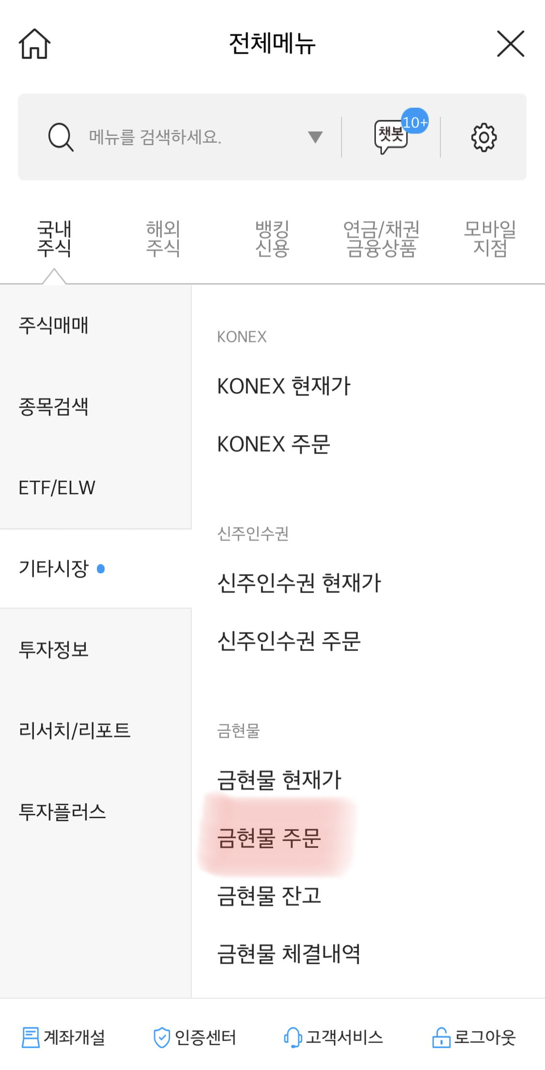 - [국내주식] - [기타시장] - [금현물] - [금현물 주문]으로 들어갑니다.