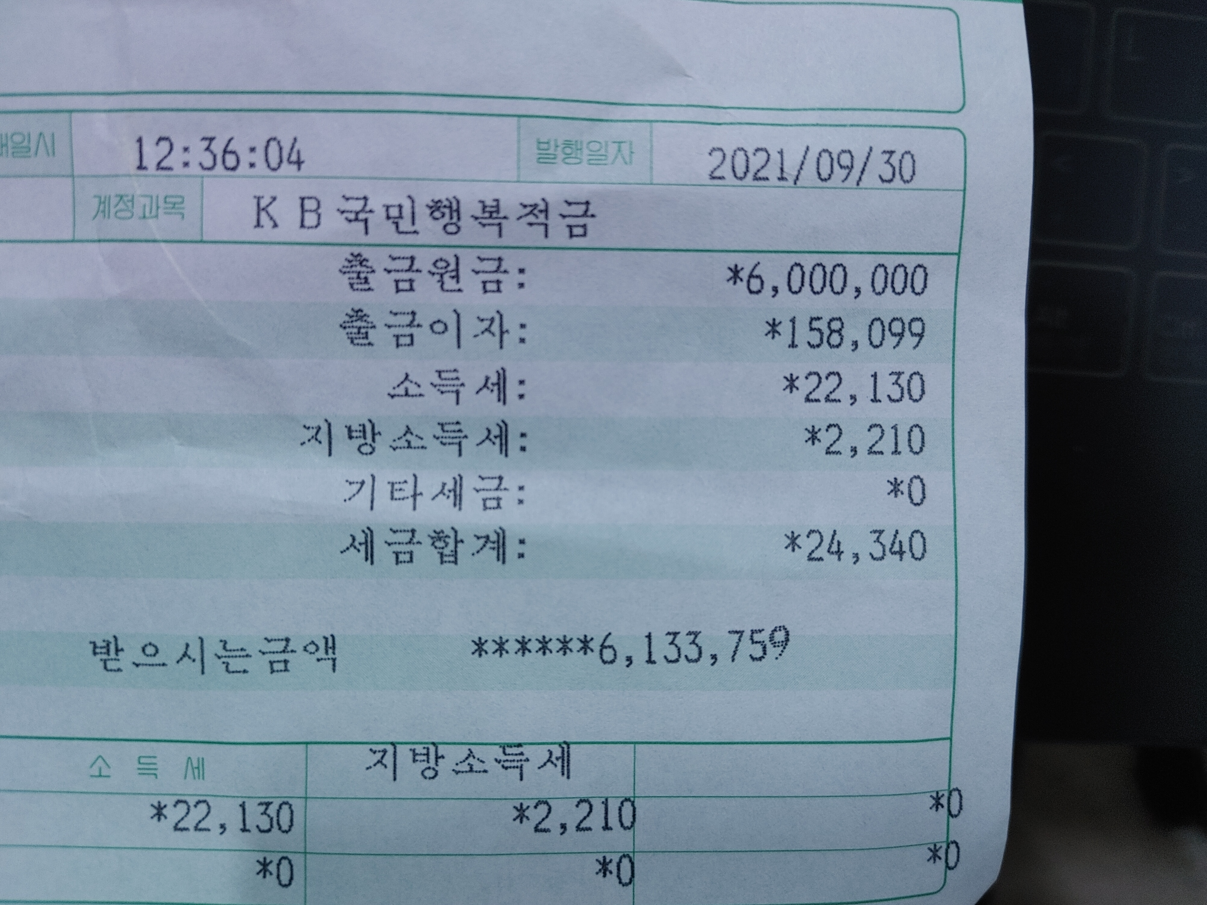 실제로 발생한 이자는 158,099원(세전)이었다. 이런, 저런 세금을 떼 가고 내 주머니로 들어온 이자는 133,780원이었다. 나는 만기 해지하면서 원금과 이자를 현금으로 받았다.