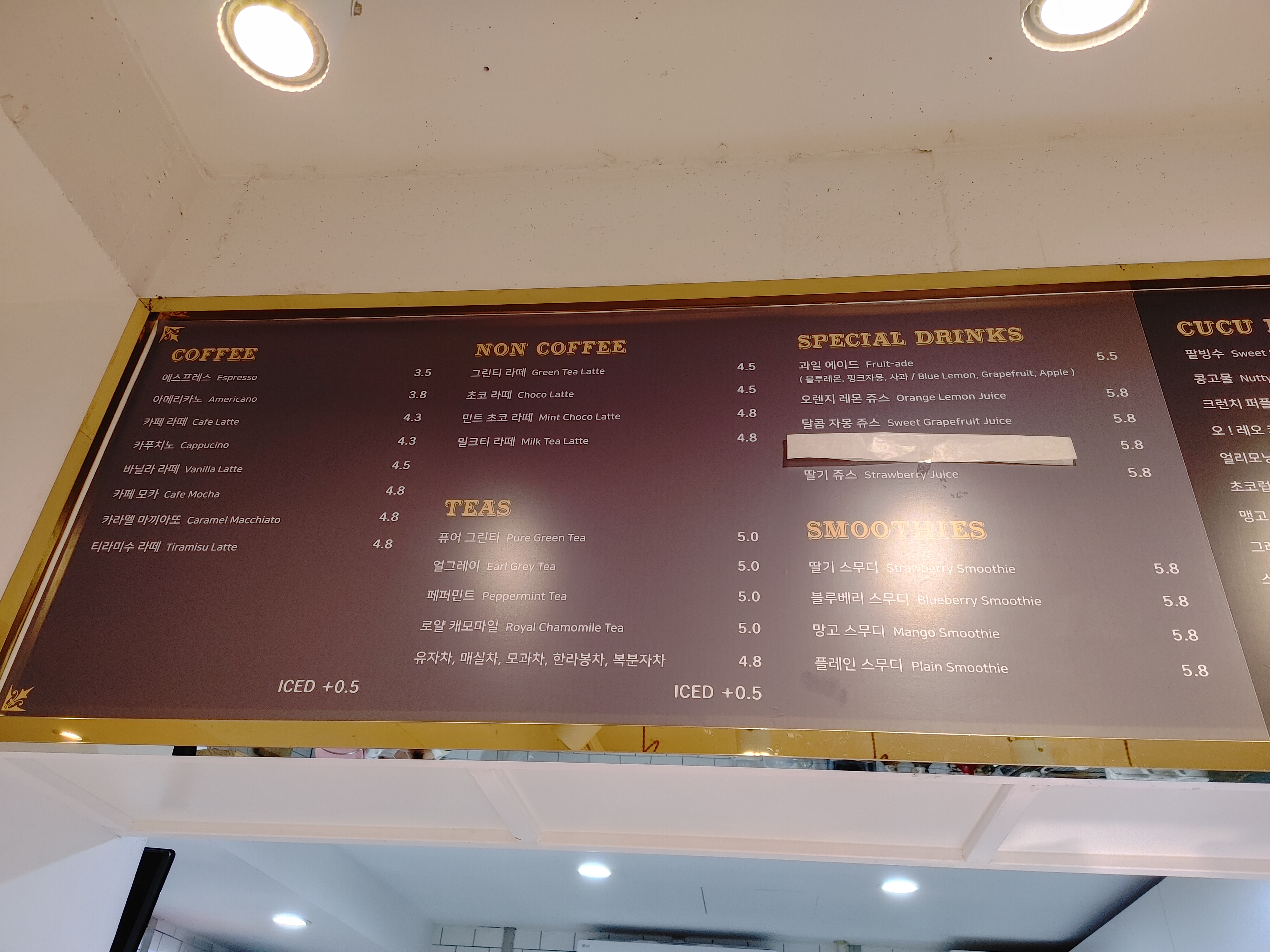 핑크버터 음료 메뉴는 커피, 티, 라떼, 에이드, 주스, 스무디, 빙수가 있었다. 가격은 개인 카페 평균 정도 되는 듯. #홍은동카페 #홍은동베이커리 #홍은동빵집