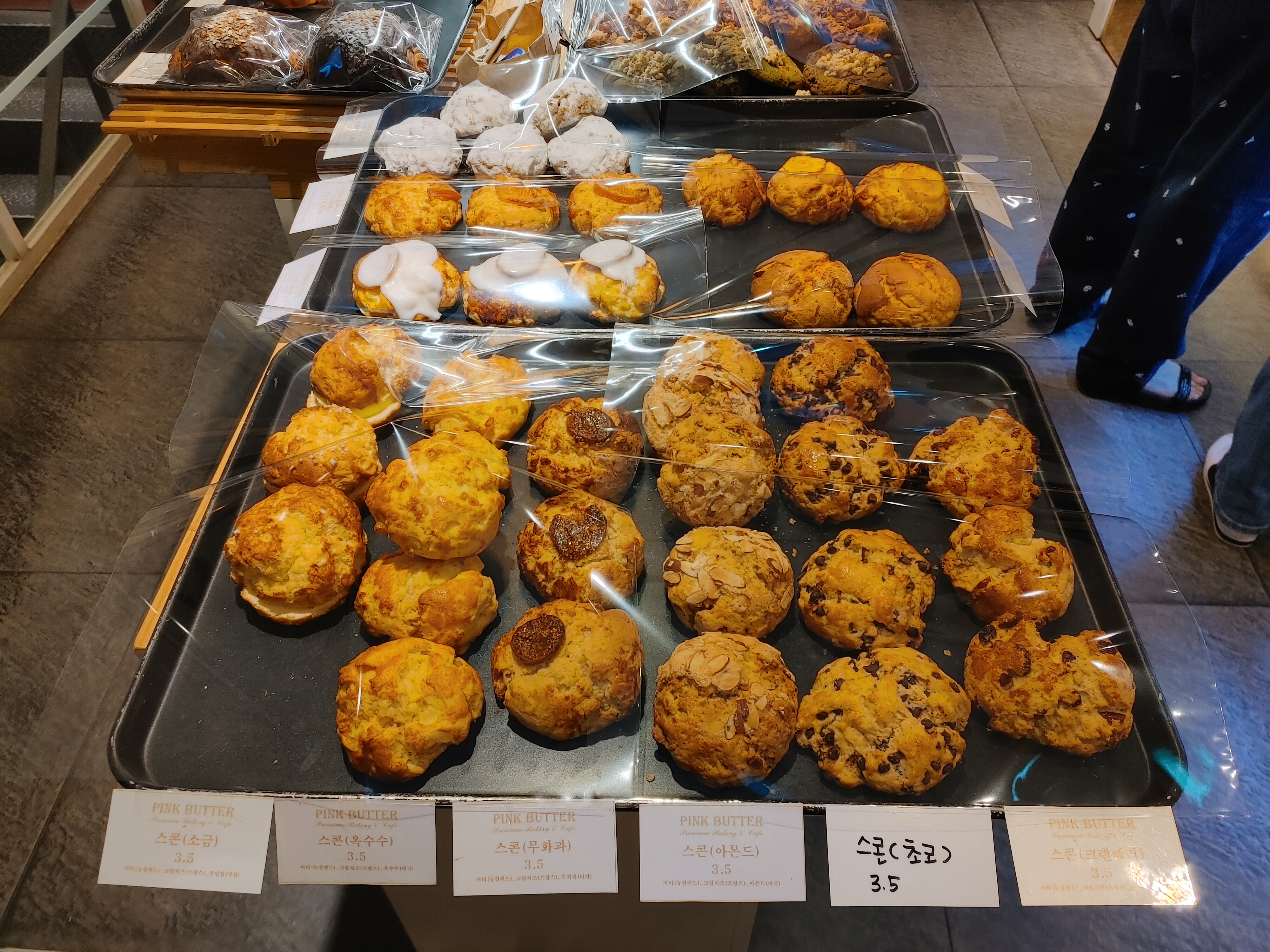 그래도 스콘류, 식빵류, 바게트류, 케이크류, 브라우니, 러스크, 깜파뉴, 기본 빵류(단팥빵, 버터롤, 크림빵 등) 등 선택할 수 있는 종류가 많았다. #핑크버터빵종류 #핑크버터가격