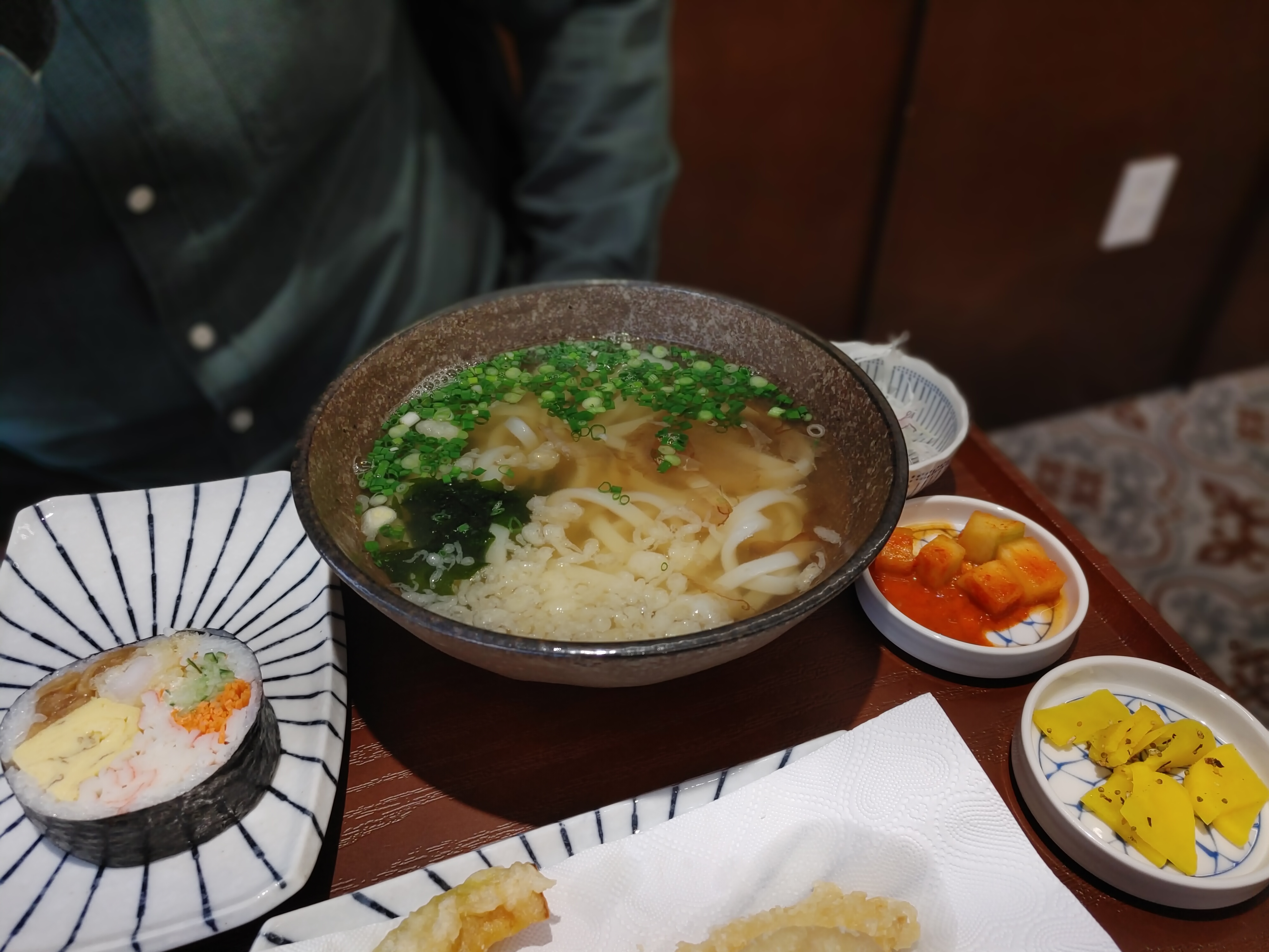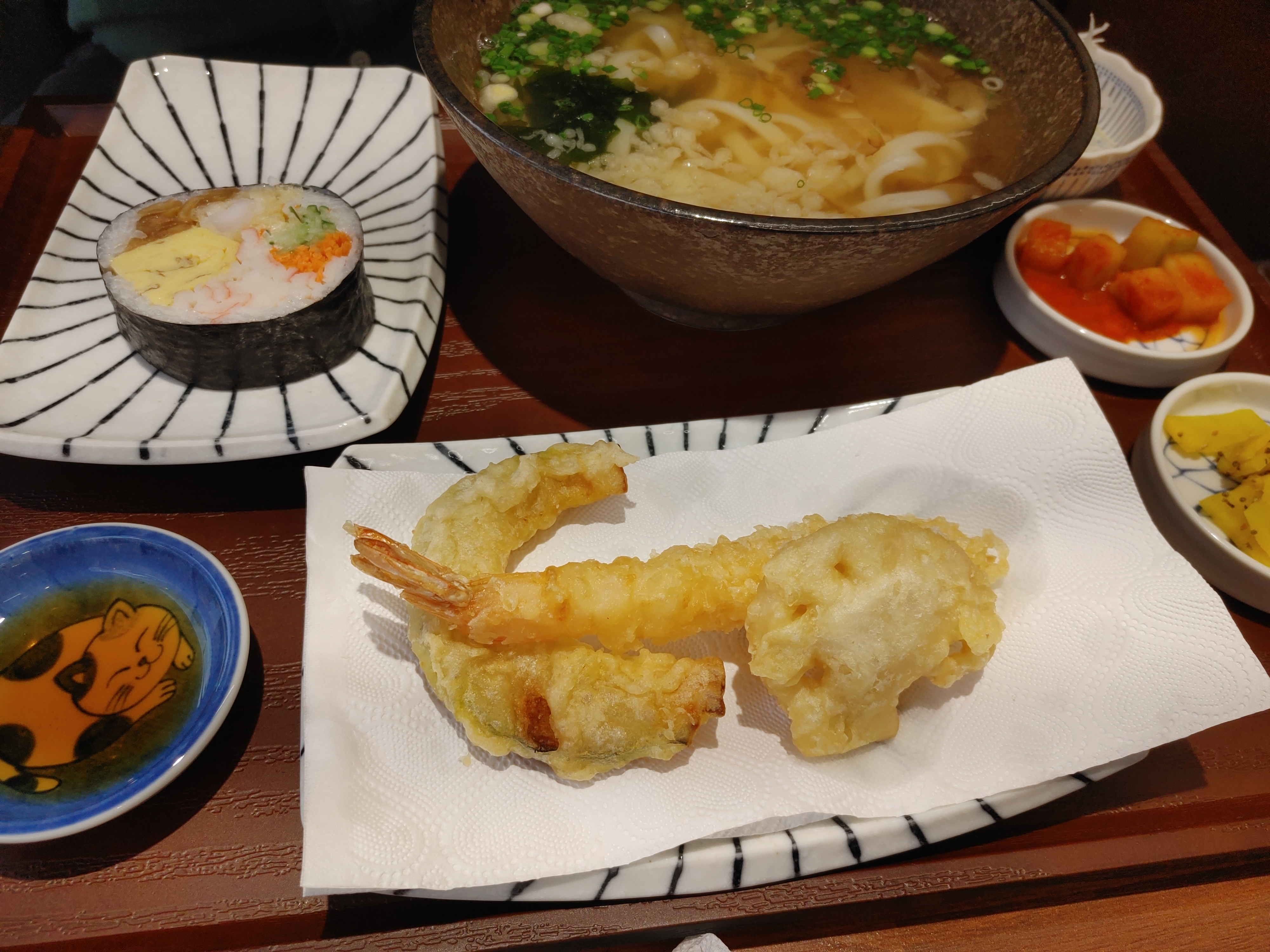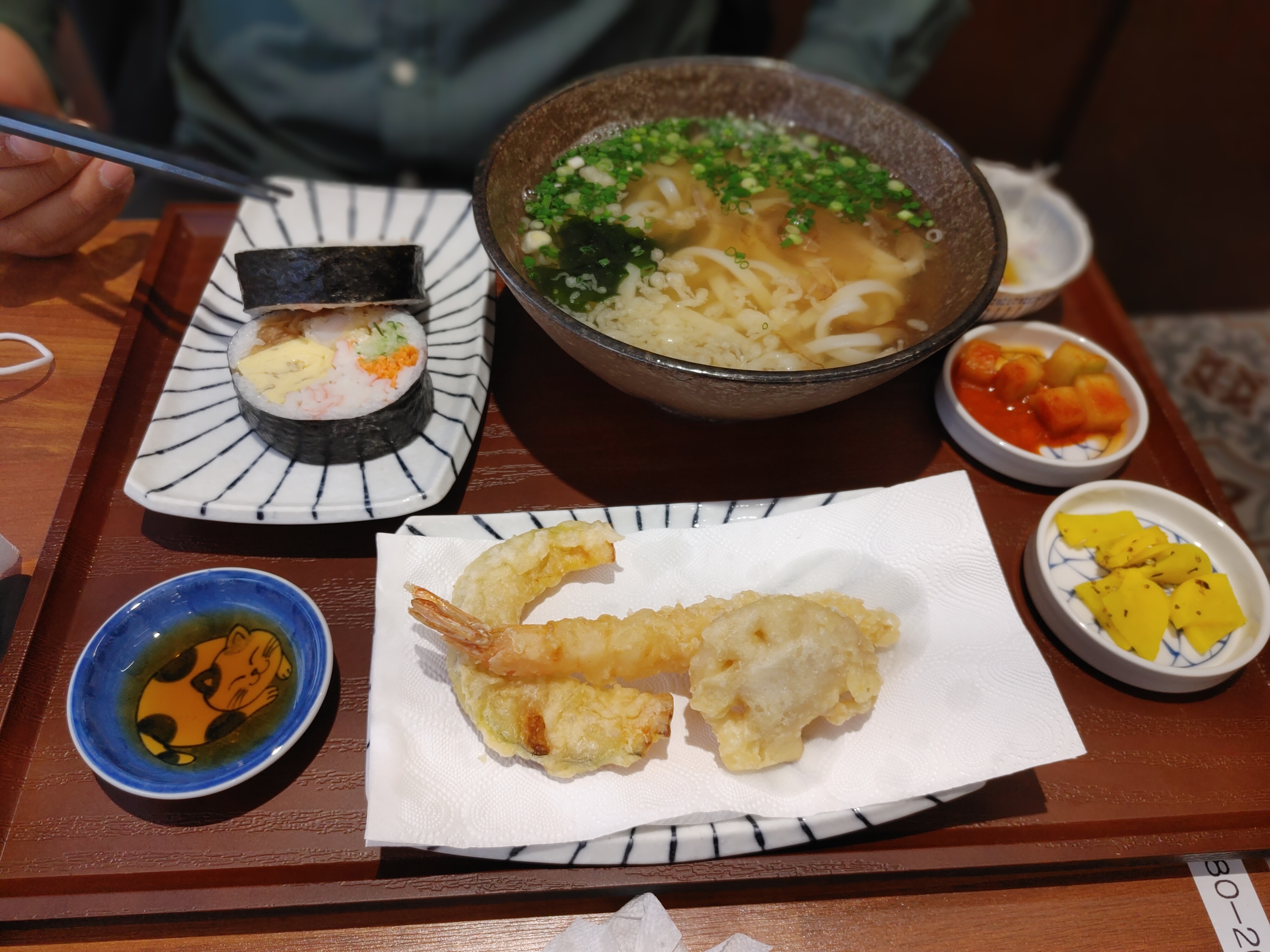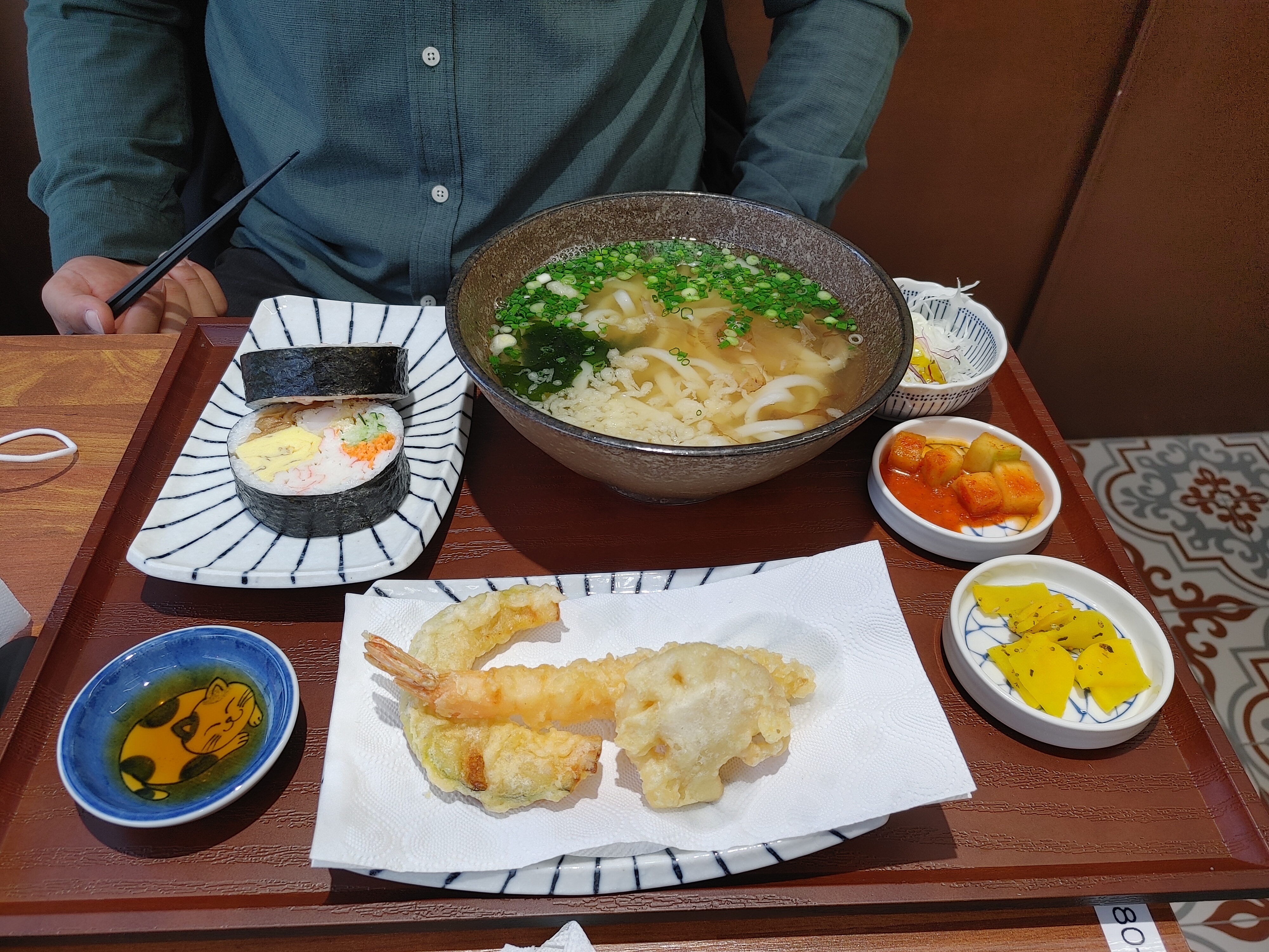 우동정식은 우동(따뜻한 우동 or 차가운 우동 중 택 1) + 훗토마끼 + 튀김으로 구성되어 있다.