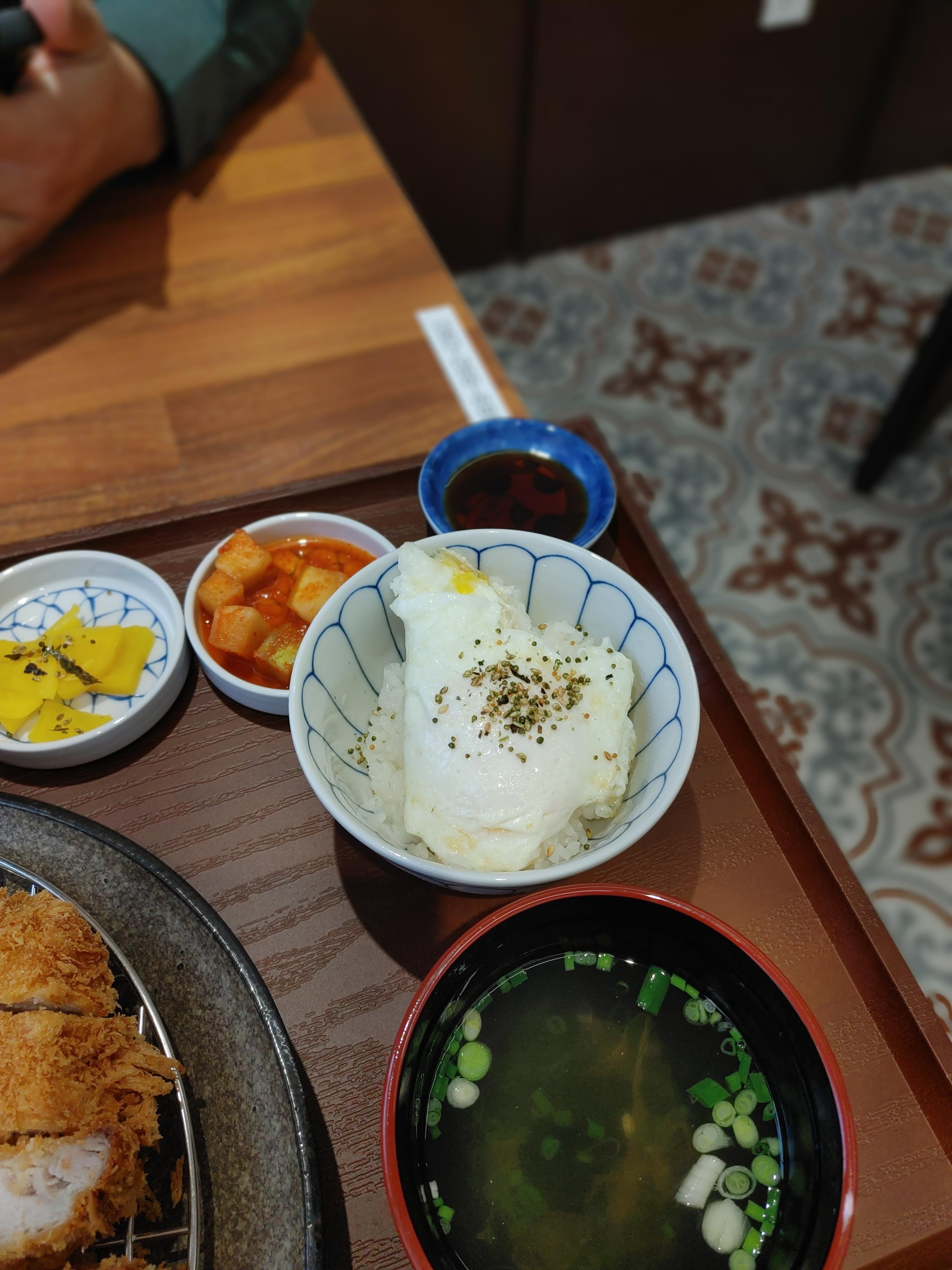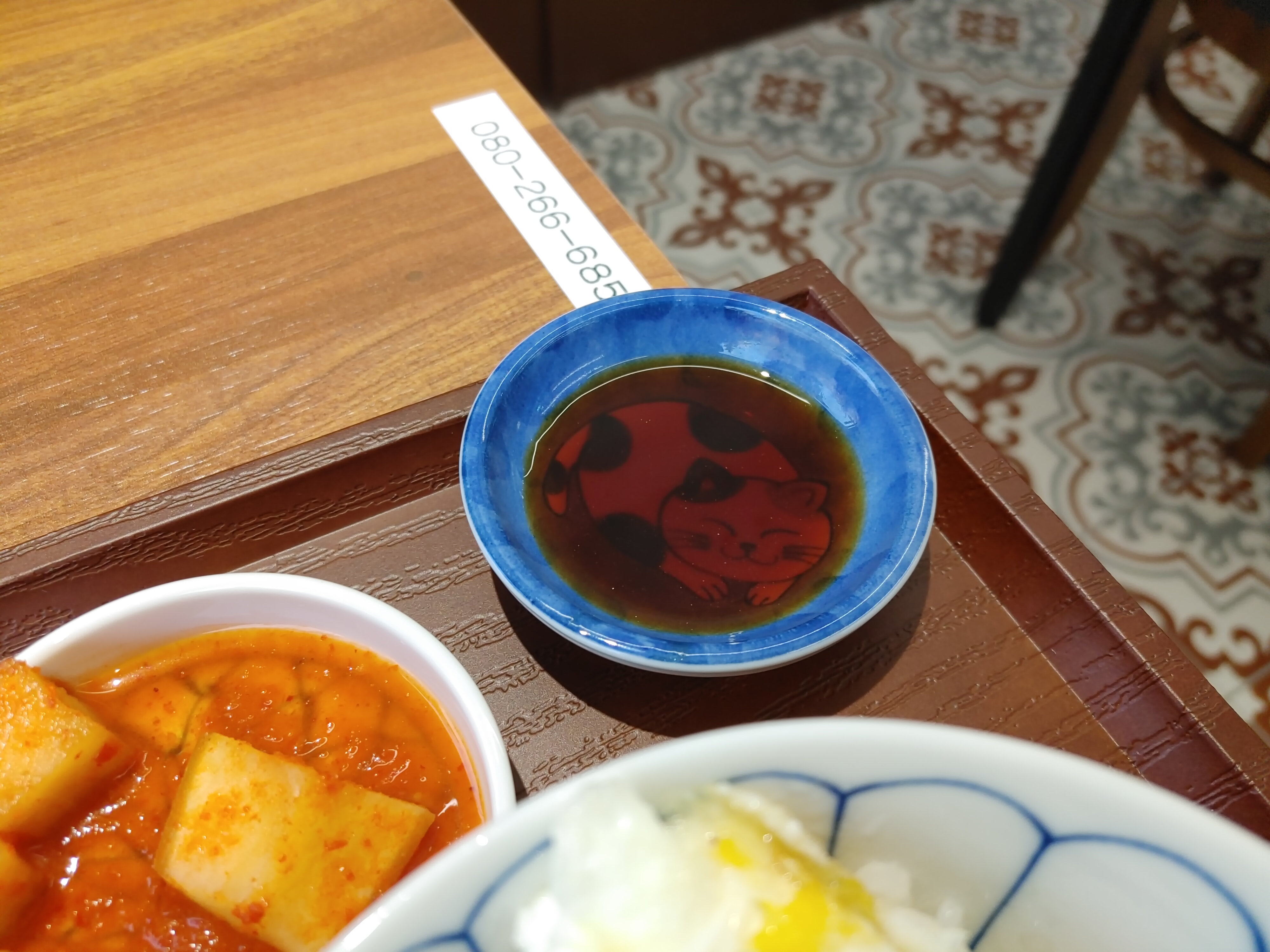 계란 간장밥은 특제 간장이 같이 나온다. 누구나 아는 그 맛이지만 이게 왜 이렇게 맛있는지 모르겠다. 간장 소스를 담아준 그릇에 고양이가 비쳤다. 이건 또 왜이렇게 깜찍하지... ㅎ 밑반찬과 장국은 평범했다. #서울여자간호대맛집 #홍제동맛집