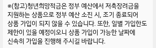 청년희망적금은 정부 예산이 지원되는 상품이어서 예산 소진 시 조기 종료된다고 한다. 해당일 되도록 빨리 가입하는 게 좋다.