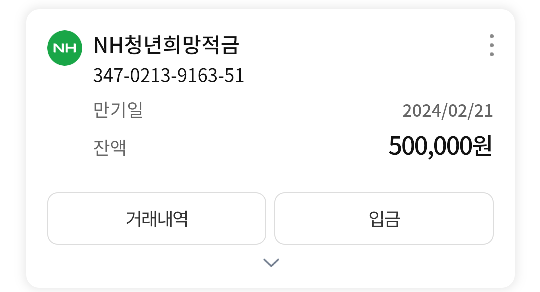 2. 농협중앙회 입출금 통장에 가입금액을 넣어둬야한다. 청년희망적금 최초 가입금액이 이 통장에서 출금되고 가입금액은 1,000원 ~ 500,000원까지 가능하다.