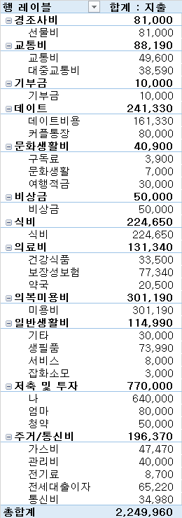 그동안은 엑셀에 날짜, 사용처, 금액으로만 간단히 기록해두었다. 그런데 한달에 식비로 얼마 썼더라? 한달 문화생활로 얼마를 썼더라? 파악하기 힘듦. 그래서 이번에 구분을 넣고 피벗테이블로 보기 편하게 정리를 했다.