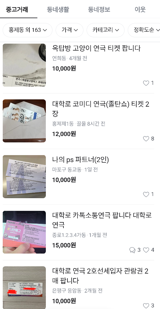 연극 관람 후 같은 공연장의 다른 연극 초대권을 뿌리고는 합니다. 그래서 당근 마켓이나 중고나라에서 연극 초대권을 구할 수 있습니다. 네이버 예약보다 더 저렴하지만 내가 원하는 연극 초대권을 찾기는 어려운 경우가 많습니다. 그래서 올라온 초대권 중에 마음에 드는 연극으로 골라봐야 한다는 아쉬움이 있습니다.