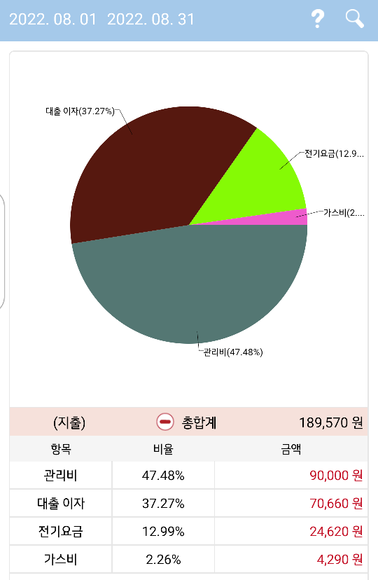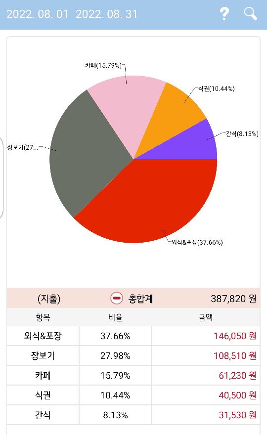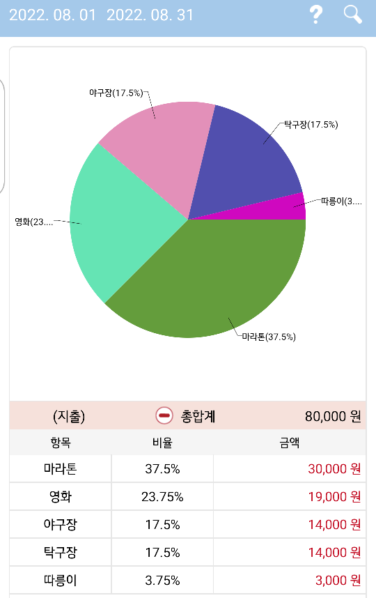 나의 8월 한 달간의 지출을 정리한 가계부이다. 이렇게 통계로 보면 내가 어느 부분에서 많은 지출이 있었는지 파악하기 쉬워서 좋다.