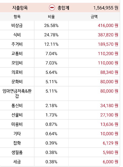 30대 1인 가구인 직장인 여성(원룸 전세 자취 중)의 한 달 지출은? 내가 표본이 될 수는 없겠지만, 나는 총 1,564,955원 지출했다.