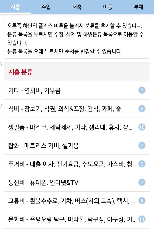 어플에 기본적으로 분류가 되어 있다. 나는 내 스타일대로 몇 개를 추가 삭제해서 사용 중이다.
