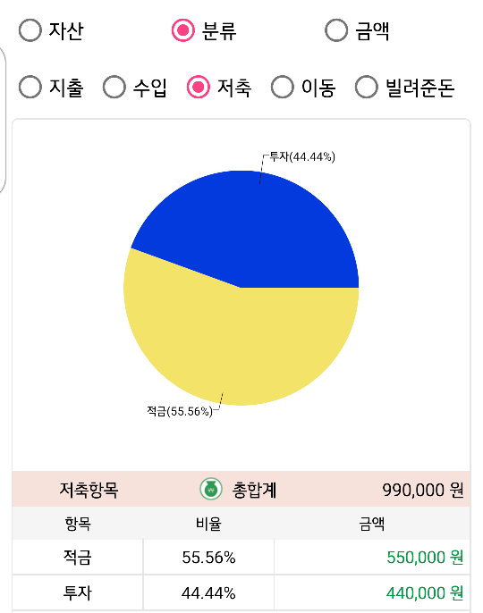 그리고 이번 달 저축 및 투자는 990,000원 했다.