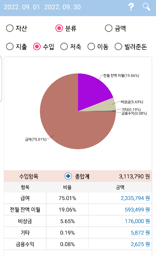 9월 수입 총액은 3,113,790원이었다. 사실 구분이 애매해서 수입으로 잡힌 항목들이 포함되어 있다. 어쨌든 급여, 금융수익이 9월의 수입이다.