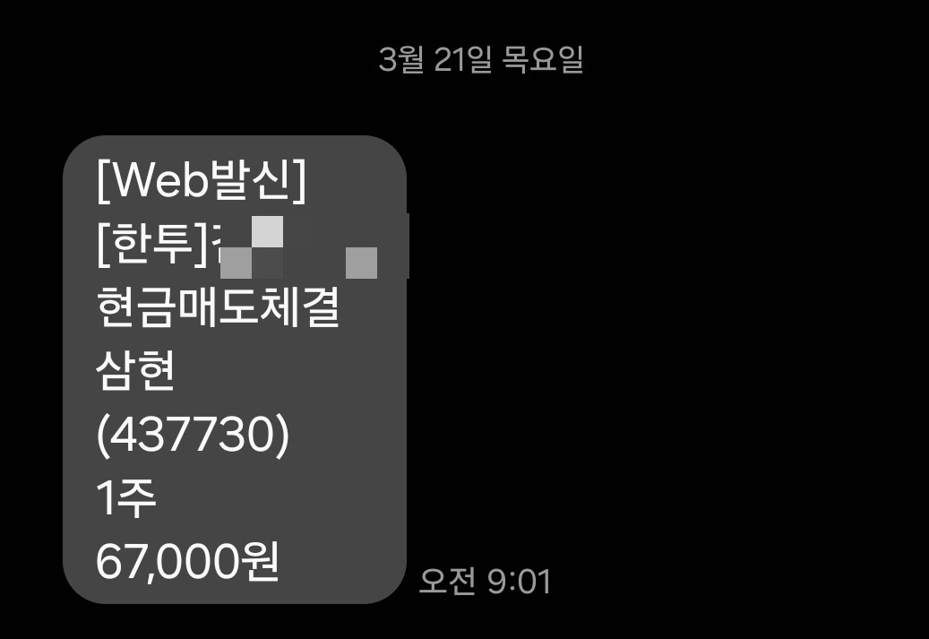 상장 당일인 오늘 오전 8시 55분에 알람을 맞춰놨었다. 미리 증권사 어플을 켜고 주식 시장 개장하자마자 삼현 주식을 매도를 했다.