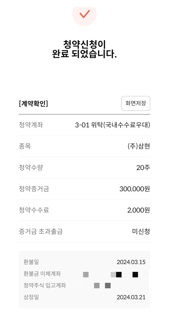 지난 3월 12일 공모주 청약을 신청했다. 최소 청약수량인 20주를 청약했다. 청약증거금은 30만 원이었다. 청약 수수료는 2,000원이고 공모주가 배정되면 수수료가 차감된다. 3월 15일 증거금 환불일에 청약 수수료와 배정된 주식가격을 차감하고 환불되었다. (공모주가 미배정되면 수수료도 환불된다.)